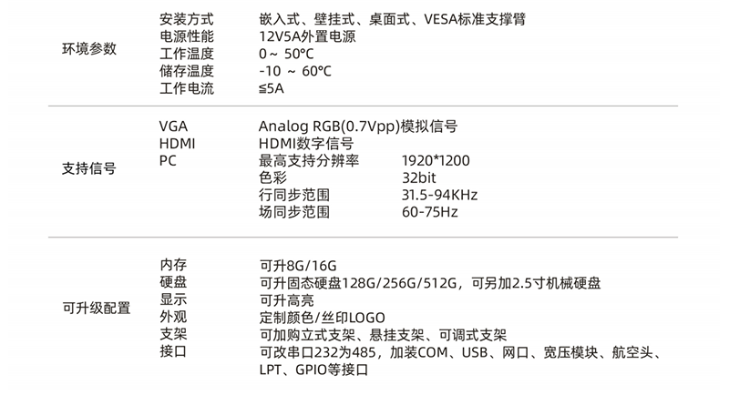 | 屏幕面板 | 工控A规屏 TFT面板 |