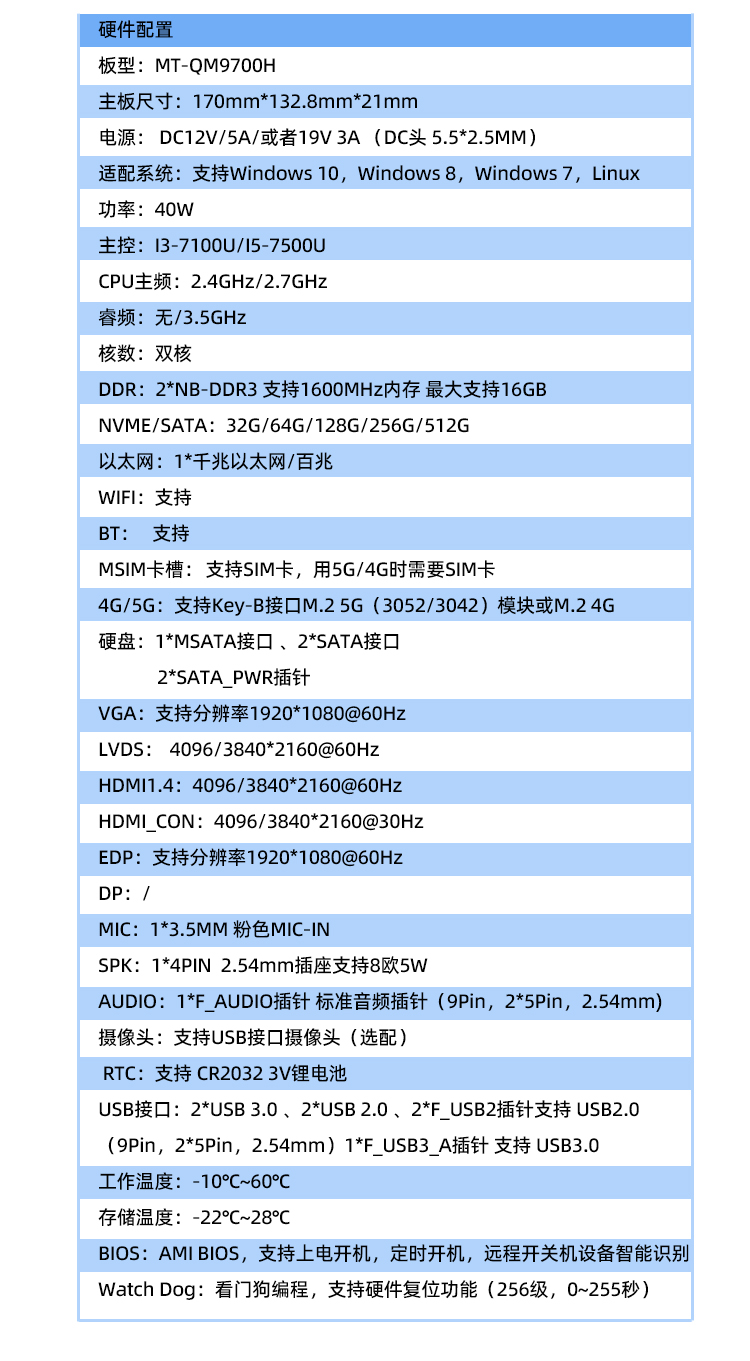 MT-QM9700H-UA主板支持搭载英特尔赛扬系列,I3/I5/I7处理器。MT-QM9700H-UA属于高性能X86架构产品,基于先进制程,并支持多种操作系统!