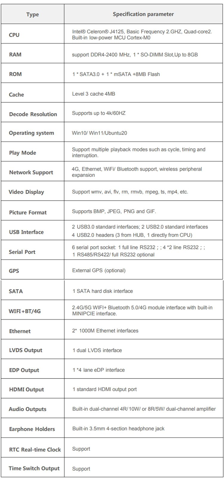 | CPU | Intel® Celeron® J4125, Basic Frequency 2.GHZ, Quad-core2. Built-in low-power MCU Cortex-M0 |
