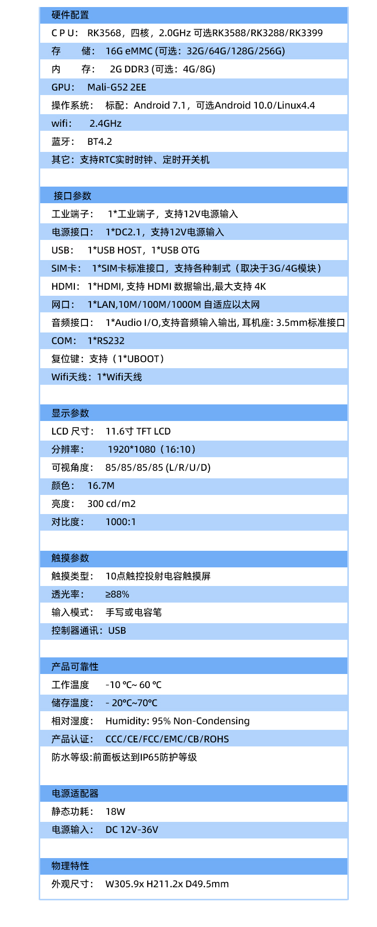 | 存储 | 16G eMMC (可选:32G/64G/128G/256G |