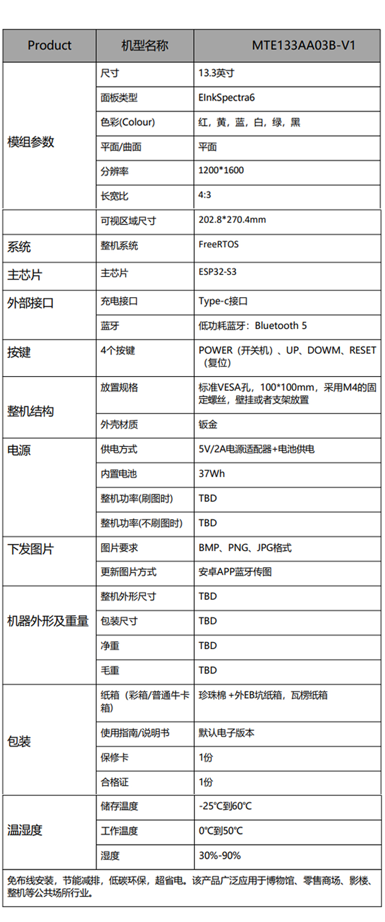 13.3寸电子纸墨水屏相框全彩低功耗1200*1600蓝牙电子墨水显示屏