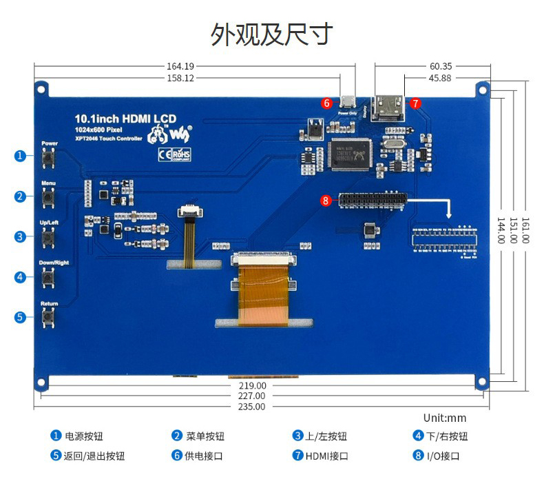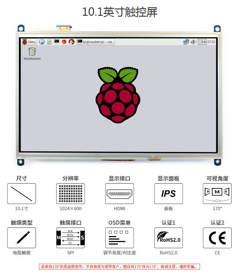 树莓派10.1寸电容触控显示屏HDMI接口1024*600分辨率